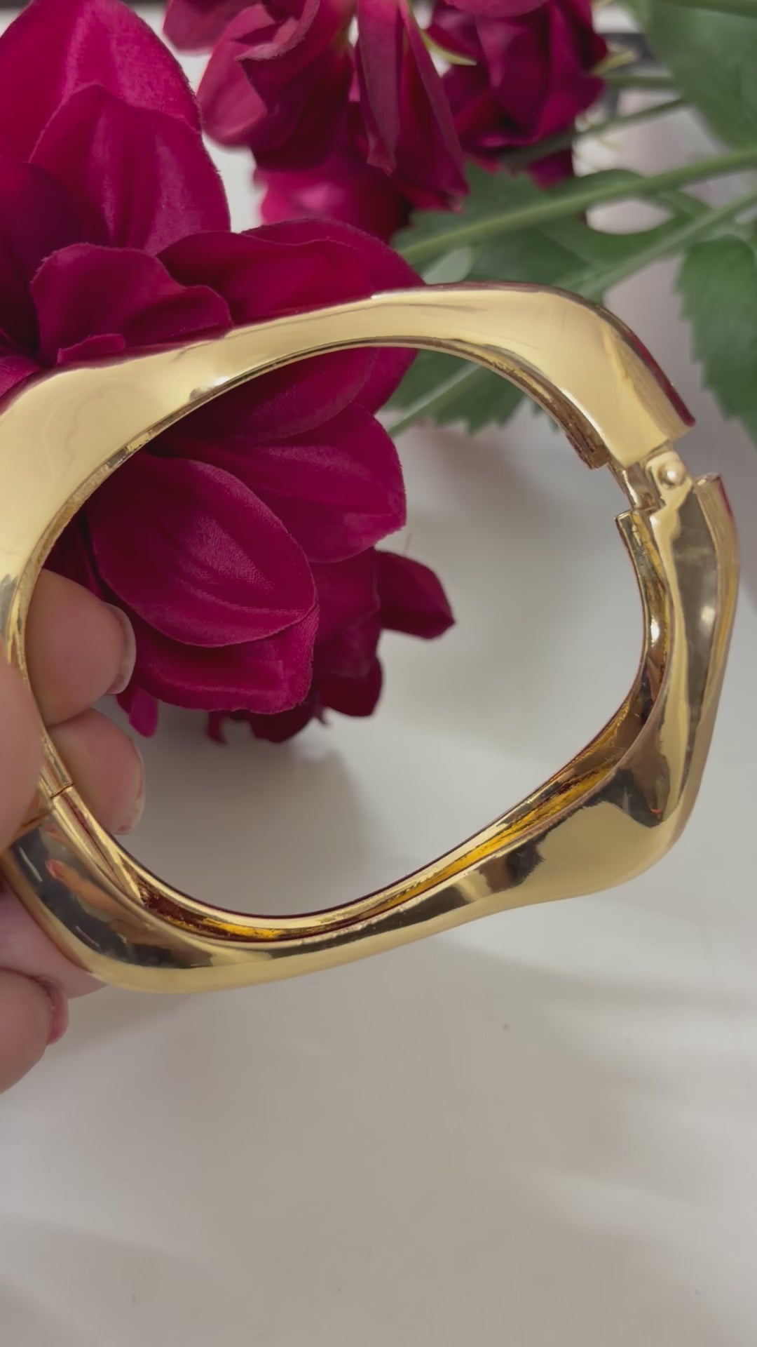 A bold gold-tone bracelet designed with a smooth, wave-like form that creates a contemporary sculptural look. The curved surface flows around the wrist like liquid metal, giving it a soft yet striking silhouette. Its highly polished finish reflects light beautifully, enhancing its luxurious appearance. The bracelet features a hinged closure, making it easy to wear while maintaining a sleek, seamless design.