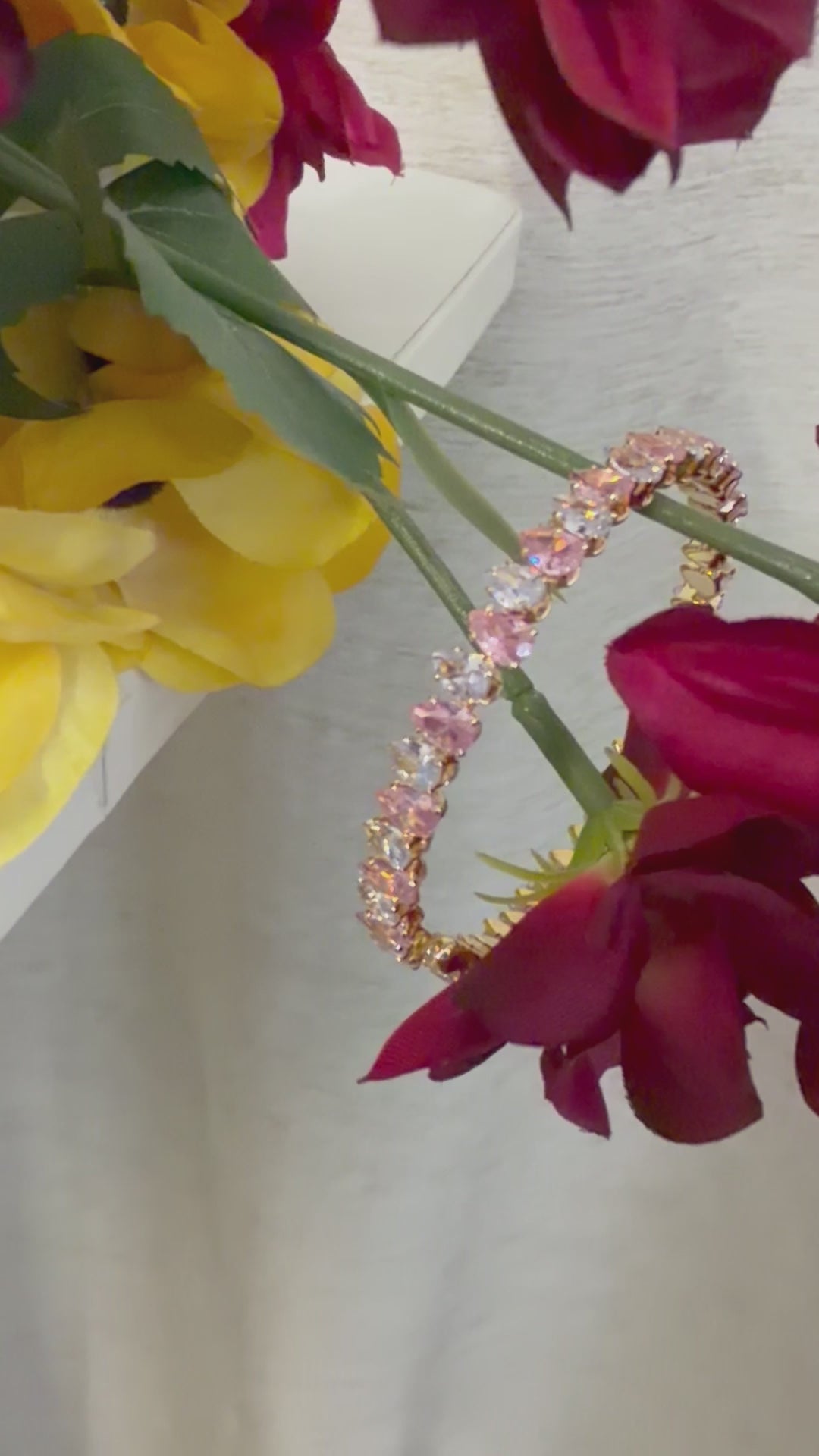 • Gemstones: The bracelet is set with high-clarity stones in a repeating pattern of pale pink and brilliant white (like cubic zirconia or lab-grown sapphires/diamonds).